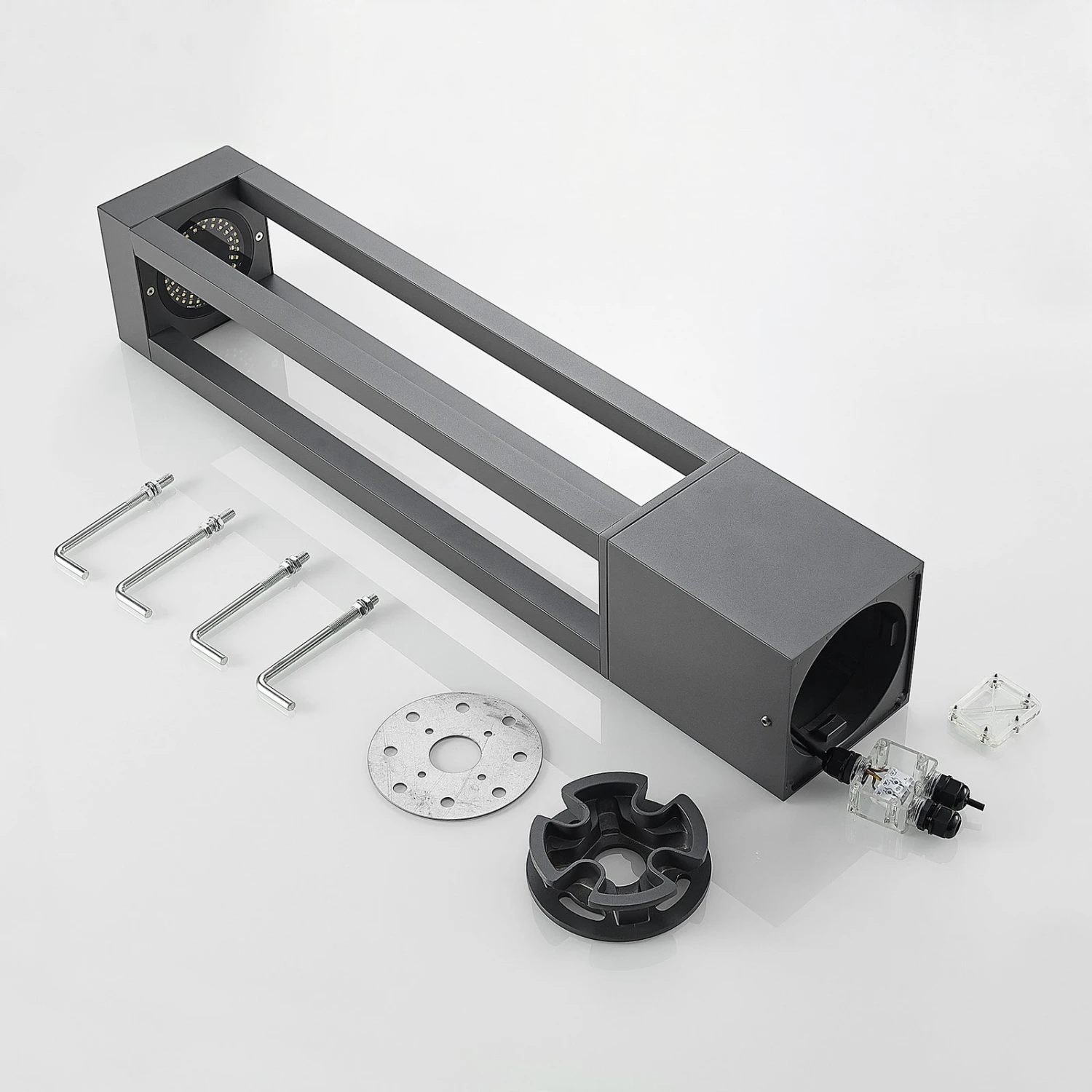 Die LED-Pollerlampe Lienna ist eine hübsche Leuchte, die praktische Eigenschaften besitzt, die sie perfekt für den Außenbereich machen. Ihr geometrischer Leuchtenkörper besteht aus dunkelgrauem Aluminiumdruckguss und überzeugt mit ihrem schlanken Aussehen. Im Inneren befindet sich ein festverbautes LED-Modul, welches das passende warmweiße Licht und ein Ambiente generiert. Durch die Schutzart IP65 ist sie ausreichend für die Wetterbedingungen vor der Tür gewappnet, denn sie ist staubdicht und gegen Strahlwasser geschützt. Das schlichte und schlanke Aussehen der LED-Pollerleuchte Lienna lässt sich mühelos in die restliche Dekoration im Garten oder in den Baustil des Hauses integrieren, sodass ein hübsches Gesamtbild entsteht.