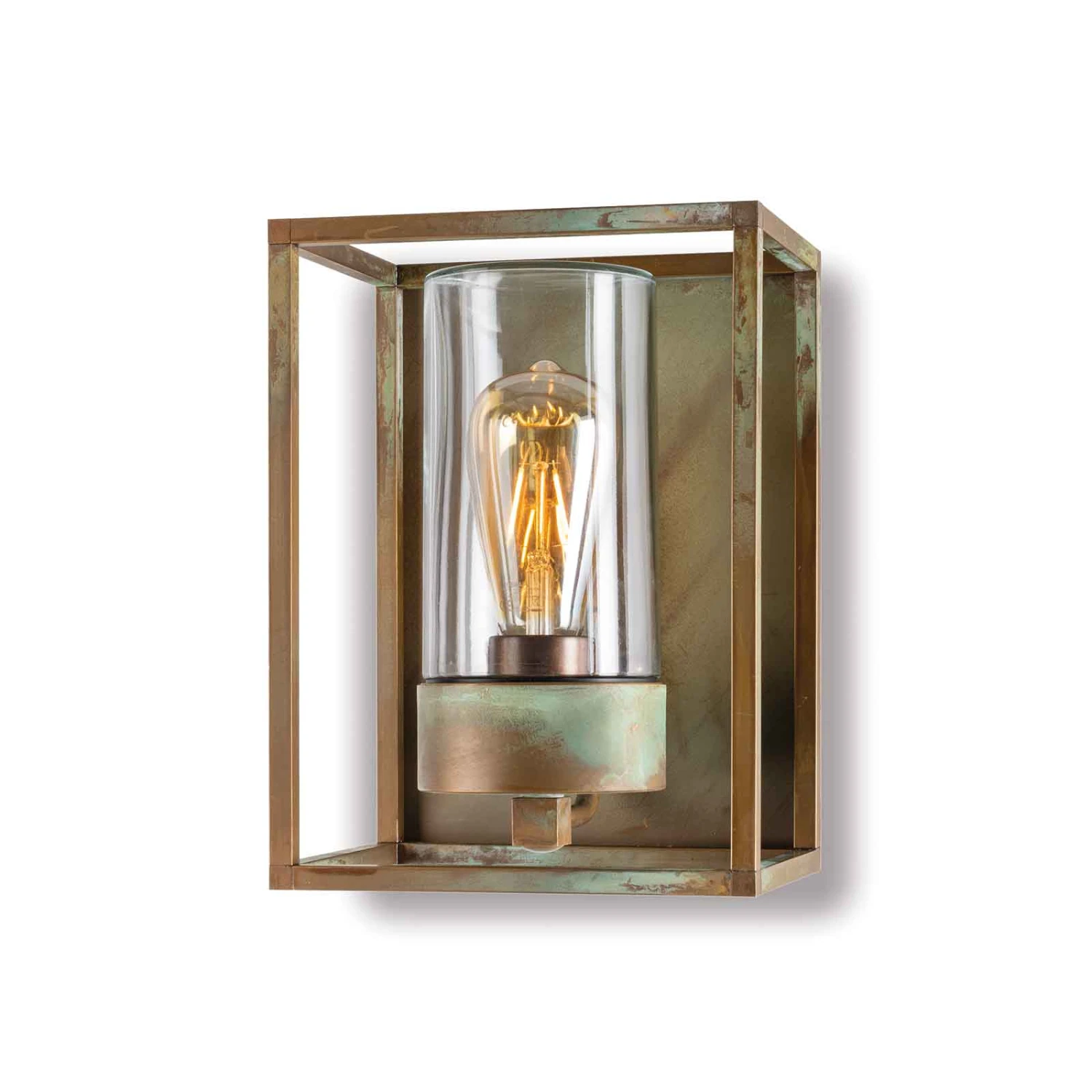 Optisch zeichnet sich die Außenwandleuchte Cubic³ einerseits durch moderne Geradlinigkeit im Design aus, andererseits erhält sie aufgrund des manuell aufgetragenen Messing-Finishs einen antiken Patina-Look, der sie zu etwas ganz Besonderem macht. Besonders ästhetisch wirkt auch die Doppeloptik von äußerem, kantigem Schirm und innerer, zylindrischer Leuchte.