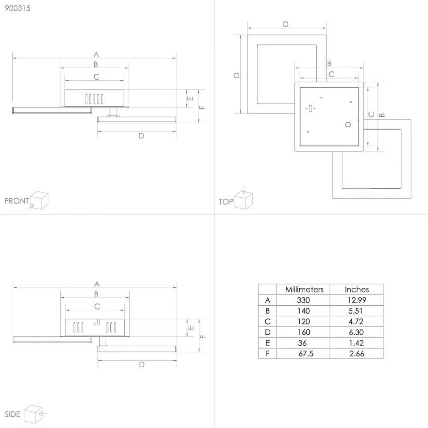 Das aus Stahl gefertigte, schwarze Gestell setzt sich aus zwei Quadraten zusammen, die die Lichtquellen bilden. Ihre LEDs sitzen auf dem Rahmen unter Kunststoffabdeckungen und erzeugen ein gleichmäßiges Licht. Die beiden Leuchtelemente lassen sich verstellen, wodurch die Lichtstrahlung beeinflusst werden kann.