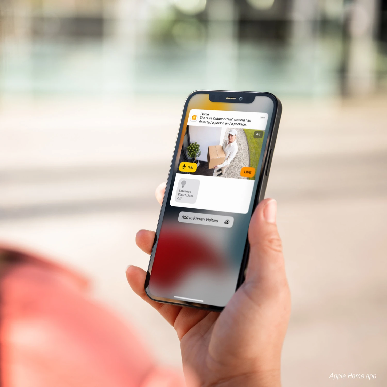 Mit der Eve Outdoor Cam lässt sich jederzeit ein gewünschter Bereich der Außenanlage überwachen. Der Benutzer erhält immer direkten und voll verschlüsselten Zugang, egal wo er sich befindet. Dabei kommt das Live-Bild mit keiner Cloud in Berührung, auch nicht mit der iCloud. Durch HomeKit Secure Video wird 100% Privatsphäre sichergestellt, denn die erkannten Aktivitäten und damit verbundenen Videos werden sicher und vollständig verschlüsselt in iCloud gespeichert, wo die Aufnahmen 10 Tage bleiben und anschließend automatisch gelöscht werden.