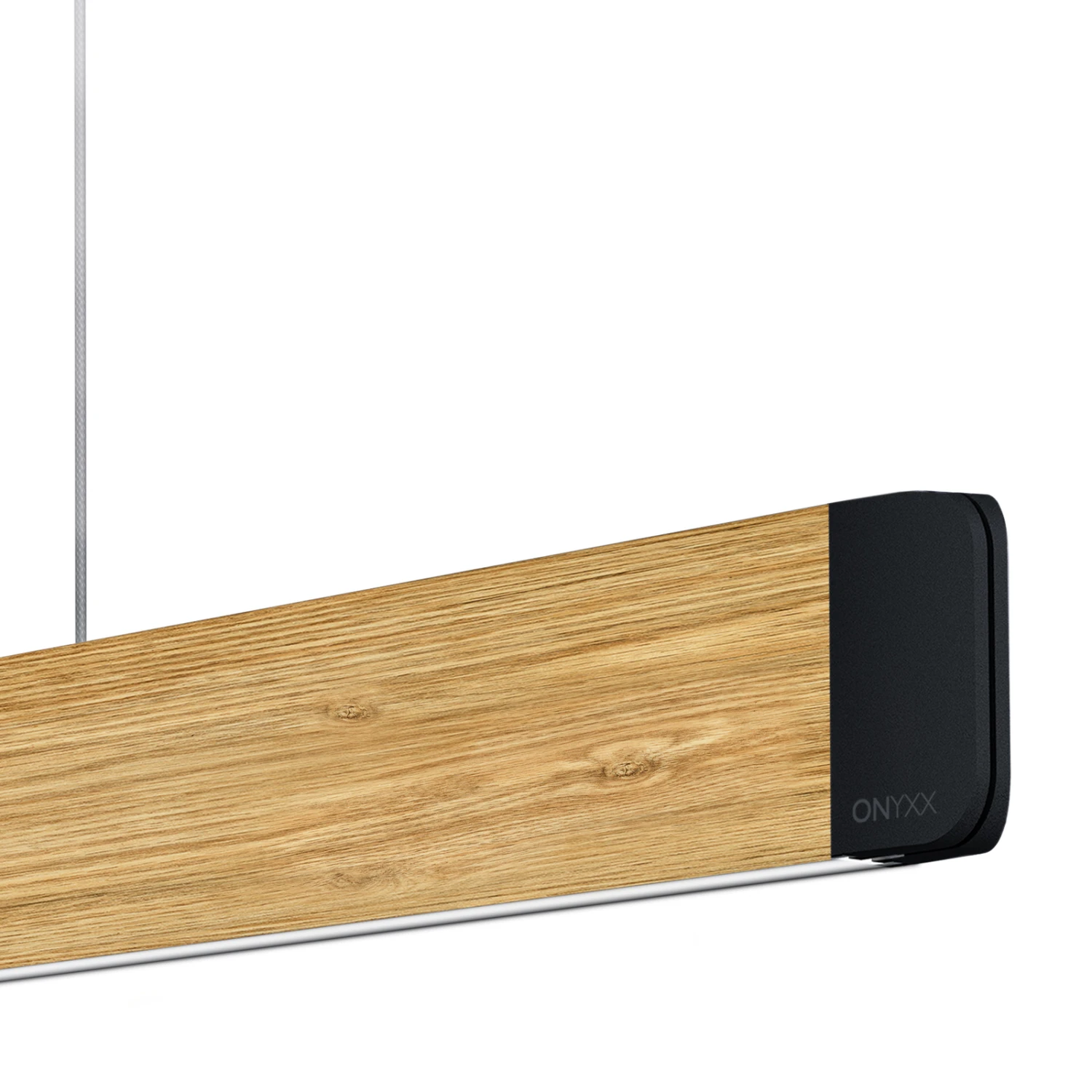 Individualisierung in Perfektion, das bietet die LED-Pendelleuchte Onyxx Linea Pro aus dem Hause Grimmeisen. Ob im privaten Wohnraum oder gewerblichen Office, diese Leuchte bietet ein Maximum an Design, Technik und Individualisierung. Erzielt wird dies durch einen schmalen Leuchtenkörper aus Vollaluminium, der durch magnetisch befestigte Echtholz-Stylecover eine Bühne der Kreativität bietet, denn diese lassen sich jederzeit auswechseln, um das Design der Einrichtung nachhaltig anpassen zu können. Besonderes Designmerkmal sind hierbei die beiden konkav geformten Endstücke aus eloxiertem Aluminium, die an den Ecken leicht abgerundet sind und eine umlaufende Schattenfuge aufweisen. Das Licht wird aus dem schmalen Balken sowohl direkt als auch indirekt abgestrahlt, die interaktive Gestensteuerung oder aber auch der kleine Schalter am Balken ermöglichen hier eine bedarfsgerechte sowie individuelle Schaltung des Lichts. Durch die Bluetooth-Funktion kann das Licht auch über die Casambi-App mit dem Tablet oder Smartphone gesteuert und dem biologischen Rhythmus angepasst werden. Eine patentierte Höhenverstellung mit unsichtbarer Stromführung bringt die Leuchte stufenlos auf die gewünschte Höhe.