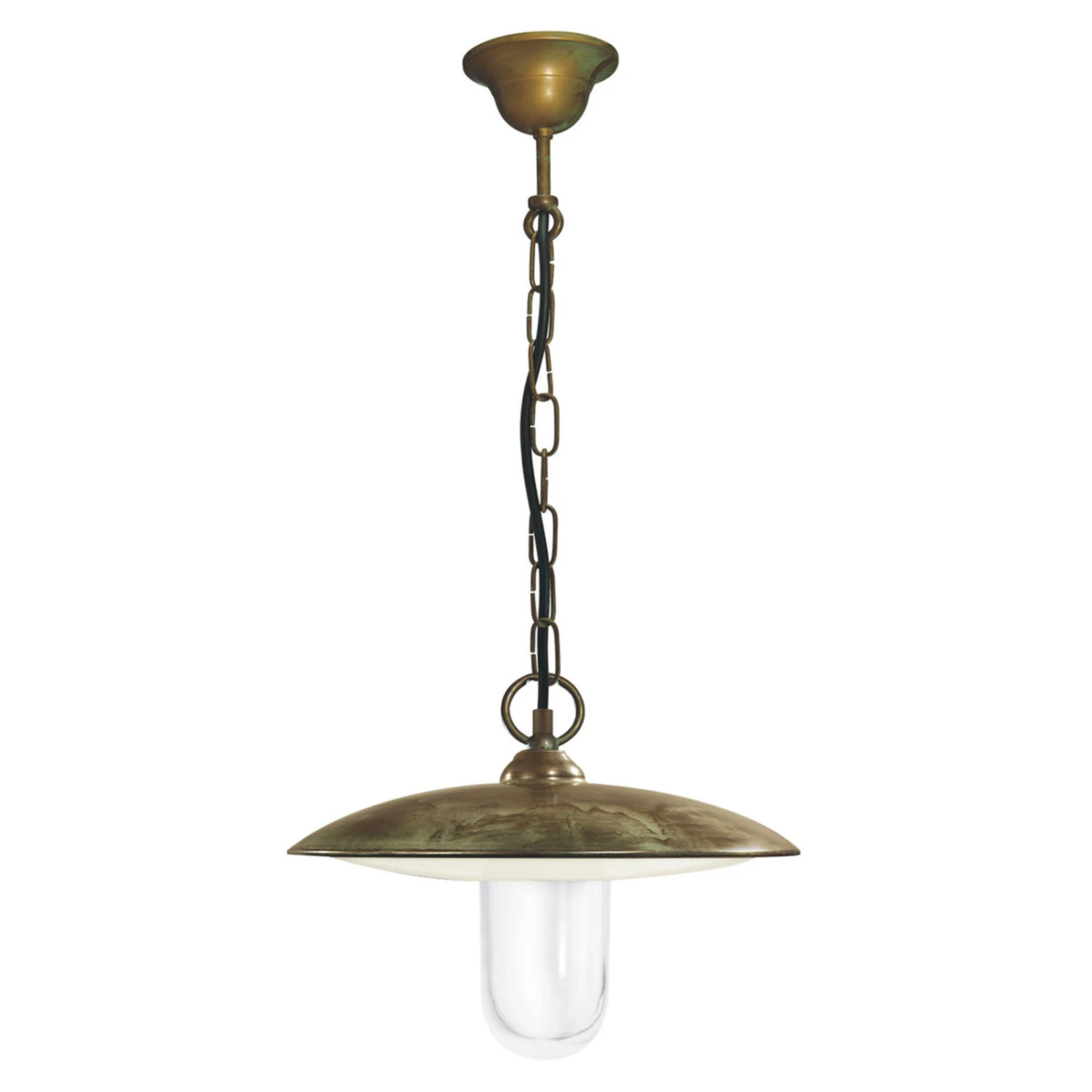 Die Hängeleuchte Golfo ist aufgrund ihrer hohen Korrosionsbeständigkeit und robusten Bauweise aus massivem Messing wie geschaffen für den Einsatz im Außenbereich. Die naturbelassene Messingoberfläche des Leuchtenschirms bildet nach einiger Zeit eine wunderschöne Patinierung, die der Leuchte einen besonderen Vintage-Touch verleiht. Die verbaute E27-Fassung, die von einem schützenden, klaren Leuchtenglas umgeben wird, lässt sich mit allen Arten von Leuchtmitteln bis max. 52 Watt bestücken.