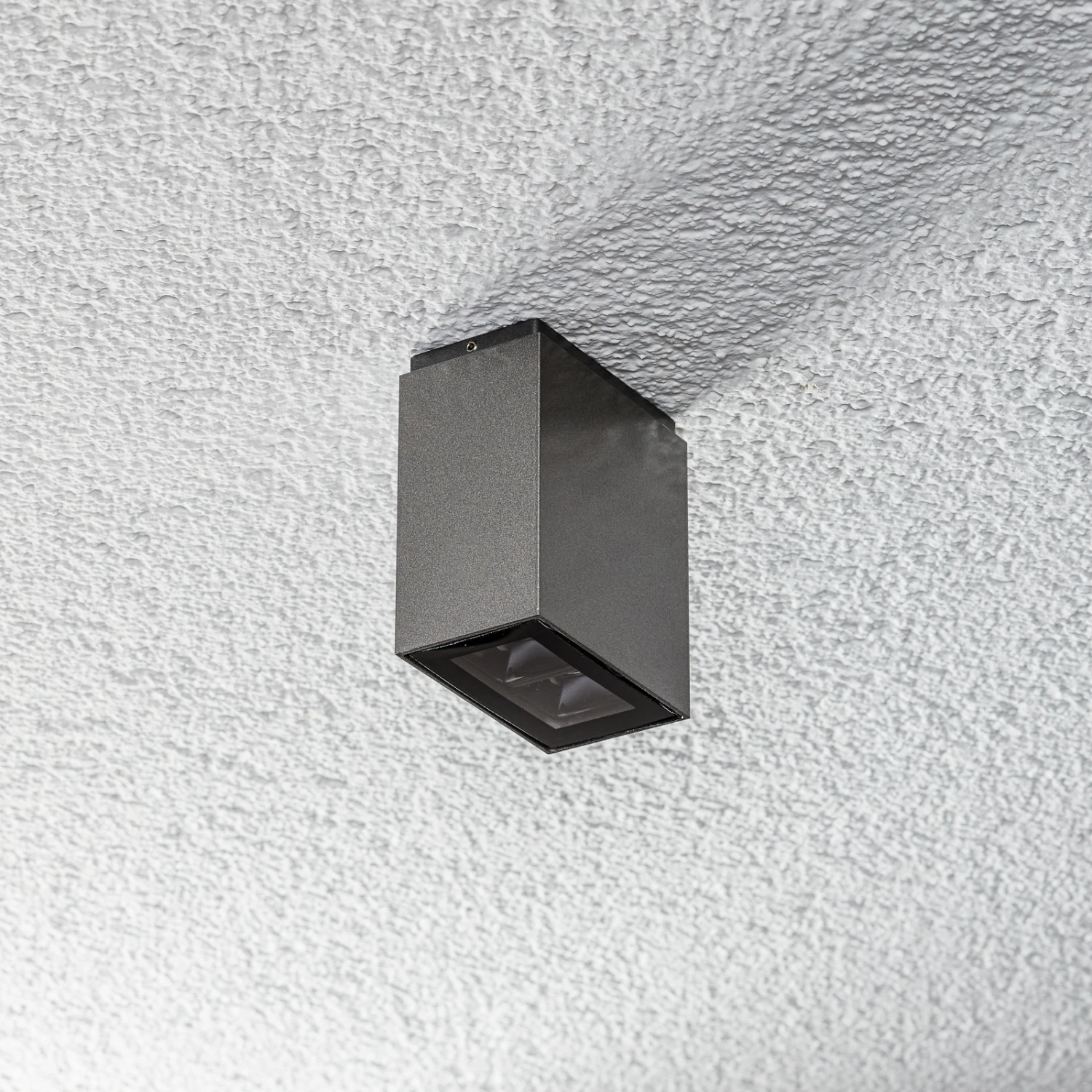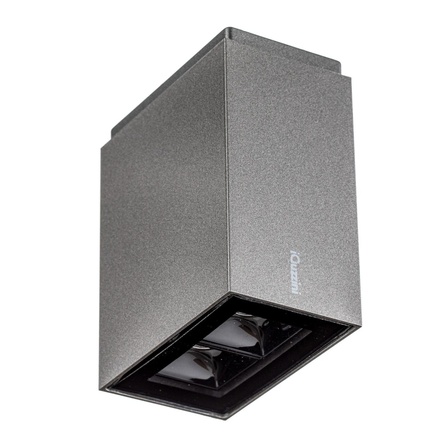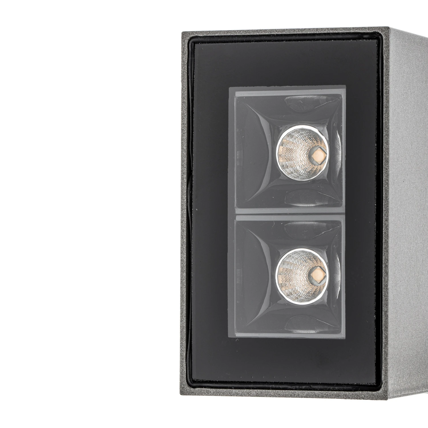 In rechteckiger Form mit zwei optischen Elementen und warmweißen LEDs wurde die LED-Außenleuchte Laser Blade InOut aus lackiertem Aluminiumdruckguss gefertigt. Im grauen Korpus sitzen zwei Opti-Beam-Optiken mit hoher Auflösung aus metallisiertem Thermoplast, integriert in den innovativen, schwarzen Blendschutzvorsatz, der für eine Emission mit kontrollierter Leuchtdichte von UGR 19 sorgt. Die besondere Gestaltung des optischen Systems bewirkt eine definierte, kreisrunde Lichtverteilung, wobei die Lichtpunktwirkung vermieden wird.