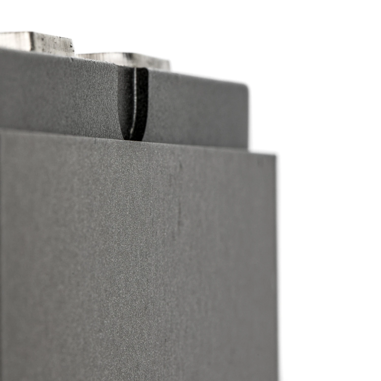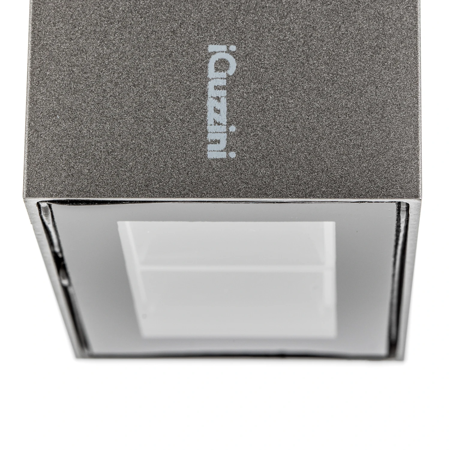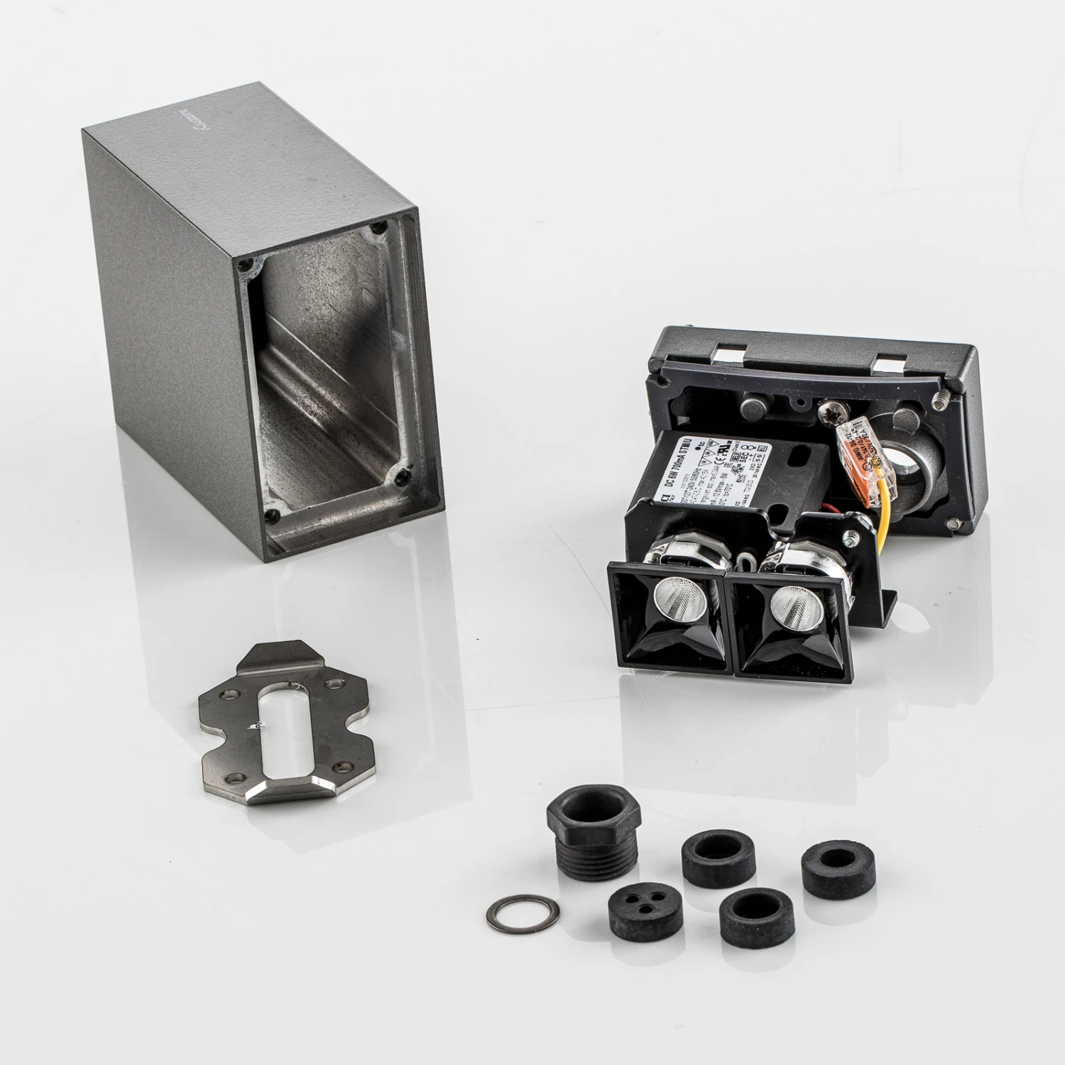 In rechteckiger Form mit zwei optischen Elementen und warmweißen LEDs wurde die LED-Außenleuchte Laser Blade InOut aus lackiertem Aluminiumdruckguss gefertigt. Im grauen Korpus sitzen zwei Opti-Beam-Optiken mit hoher Auflösung aus metallisiertem Thermoplast, integriert in den innovativen, schwarzen Blendschutzvorsatz, der für eine Emission mit kontrollierter Leuchtdichte von UGR 19 sorgt. Die besondere Gestaltung des optischen Systems bewirkt eine definierte, kreisrunde Lichtverteilung, wobei die Lichtpunktwirkung vermieden wird.