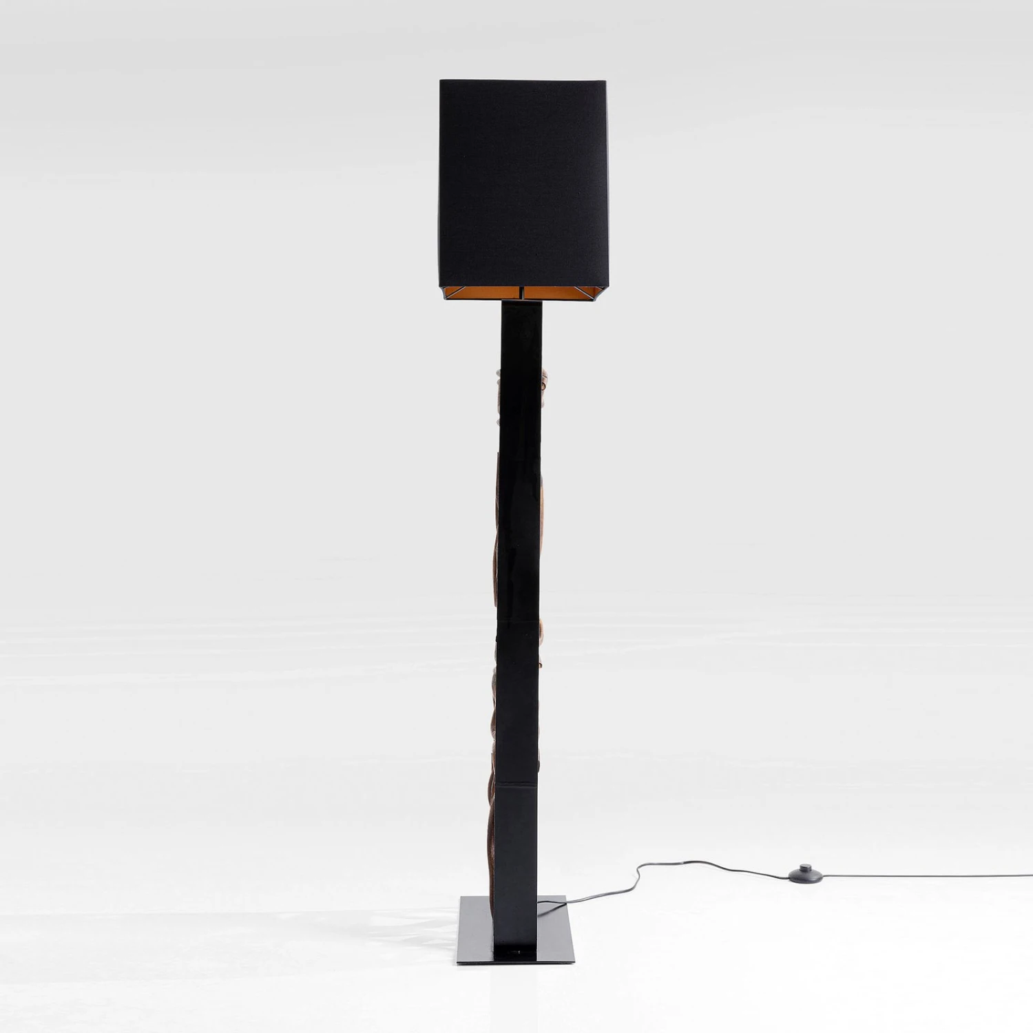 Die Stehleuchte Nature Wave ist ein kunstvolles Beleuchtungsobjekt, dessen Erscheinungsbild sehr auffallend ist. Die Grundstruktur ist denkbar einfach – eine sehr flache Basis als Standfläche, aus der ein Stahlrahmen hervorgeht, der den Fuß darstellt. Bestehend aus vier gleich großen quadratischen Kästchen sind die Konturen eher unspektakulär. Es folgt ein schwarzer Schirm aus Baumwolle und Kunststoff, der sich ebenfalls in würfelartiger Form zeigt. Das Highlight liegt bei der Füllung des Rahmens. Die vier Kästchen des Fußes sind mit wellenförmigen Holzelementen bestückt. Diese verlaufen abwechselnd von links nach rechts bzw. von oben nach unten, wodurch immer wieder eine ganz klare optische Abtrennung der einzelnen Bereiche erzeugt wird. Durch die naturbelassenen Äste kann hindurch geschaut werden. Durch die schwarze, blickdichte Beschaffenheit des eckigen Schirmes tritt kaum Licht rundherum aus, dafür aber nach oben und unten, wodurch die Holzelemente dekorativ beleuchtet werden und für interessante Schattenmuster sorgen. Die Stehleuchte fühlt sich im rustikalen Einrichtungsstil genauso wohl wie in einem modernen Wohnraum und zieht gleichermaßen wirkungsvoll den Fokus auf sich.