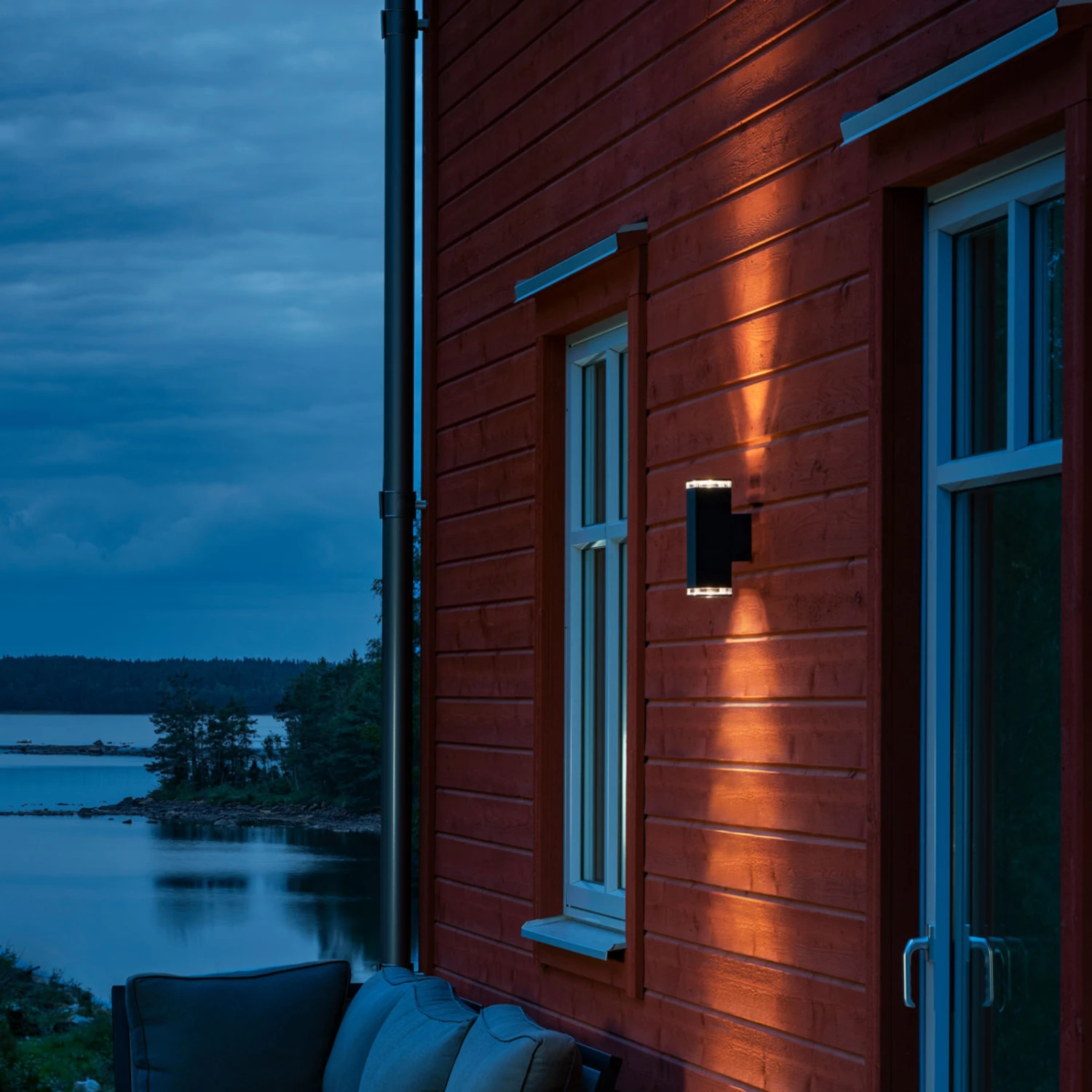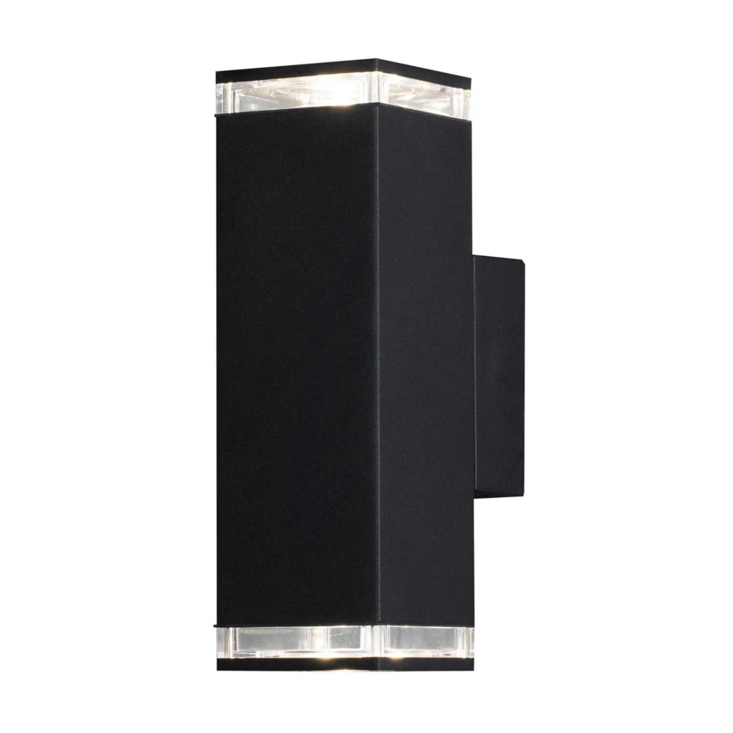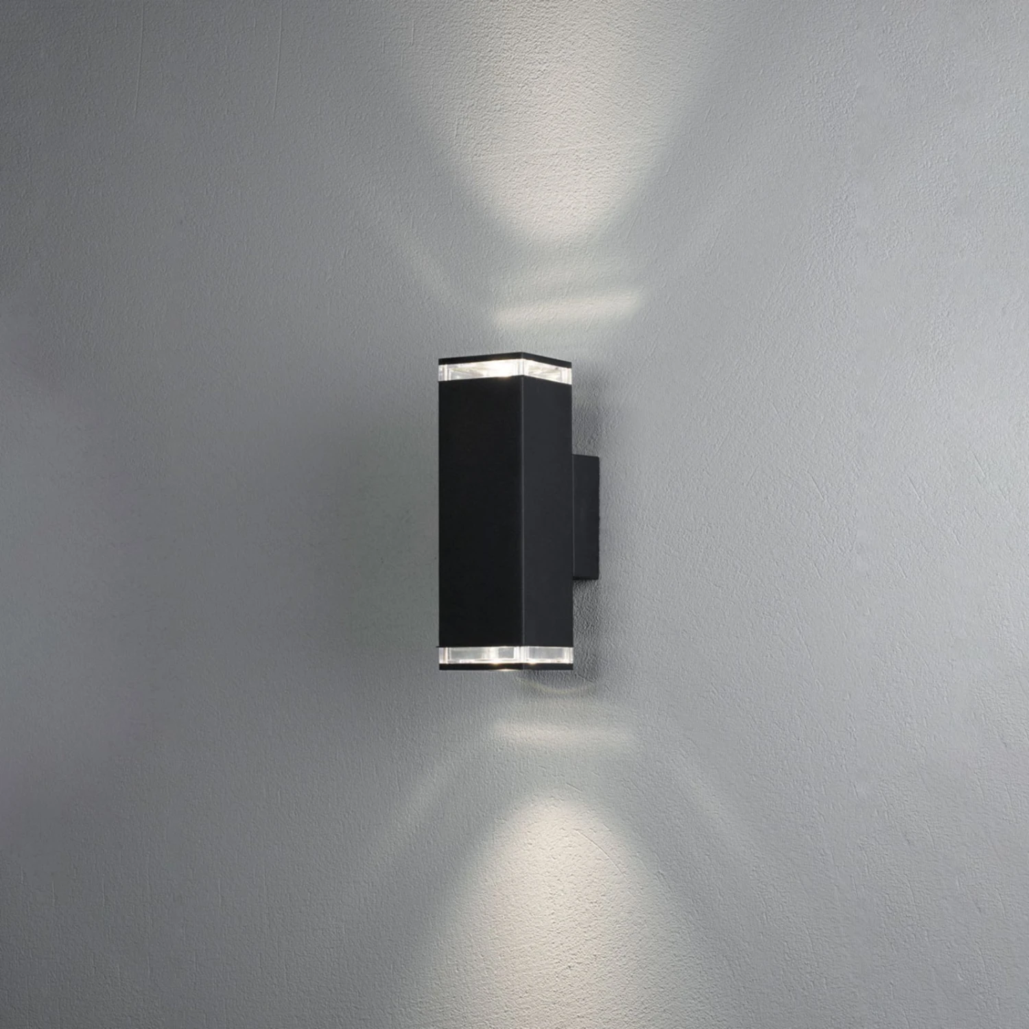 Der matt schwarz lackierte Aluminiumkorpus der LED-Außenwandleuchte Pollux ist mit zwei GU10-Fassungen bestückt, in die jeweils ein auswechselbares LED-Leuchtmittel mit entsprechendem Sockel eingesetzt wird. Die Leuchtmittel gehören nicht zum Lieferumfang und können über das Zubehör separat gekauft werden. Der obere und der untere Rand von Pollux schließt jeweils mit einem transparenten Acryldiffusor ab, wodurch die Effektivität der Lichtabstrahlung noch verstärkt wird.