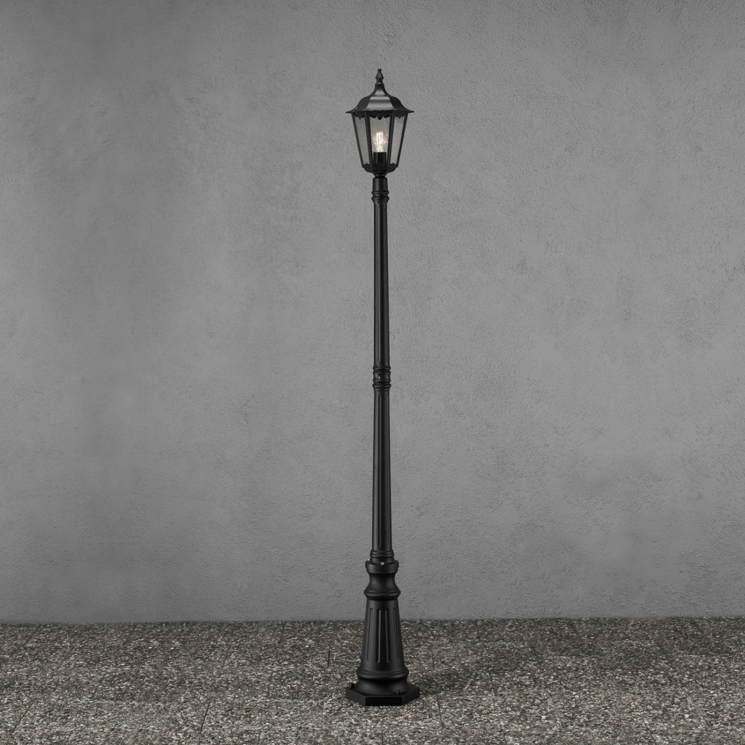 Antik wirkende Mastleuchte Firenze aus Aluminium mit formschöner Laterne auf dem hübsch verzierten Mast. Die Leuchte garantiert eine sehr gute Ausleuchtung.
