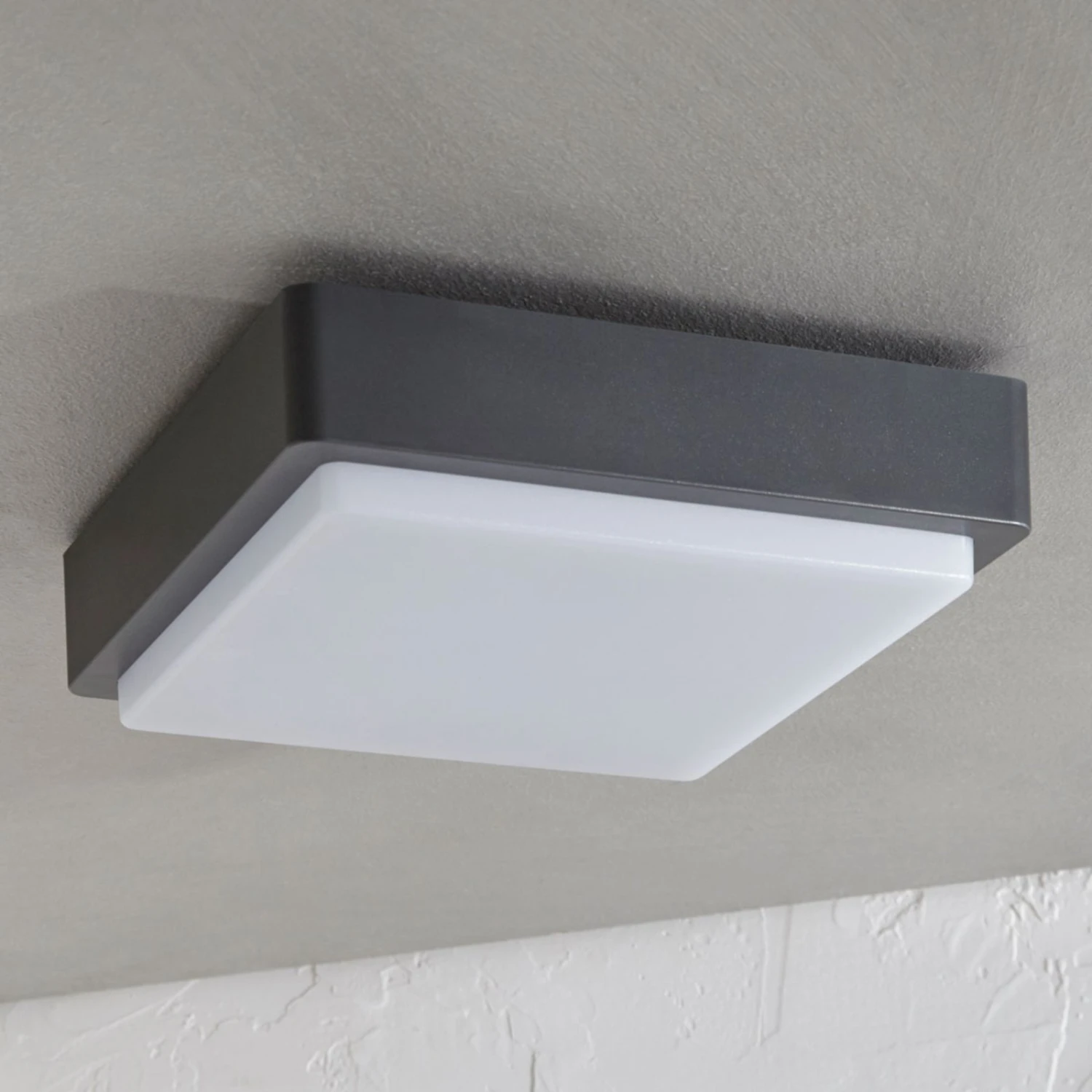 Diese quadratische LED-Deckenlampe hat ein robustes, stoßfestes Gehäuse (IK06), das aus Kunststoff gefertigt ist und zudem mit einer Seewasserfestigkeit punktet. So kann man die Außendeckenleuchte so gut wie überall im Außenbereich montieren, nicht nur an der Decke, sondern auch als Wandleuchte. Mit IP65 ist ganz allgemein ein hoher Schutz vor Schmutz und Wasser gewährleistet und das dunkelgraue Rahmenfinish (RAL 7024) der eckigen Leuchte erscheint dezent und zeitlos.