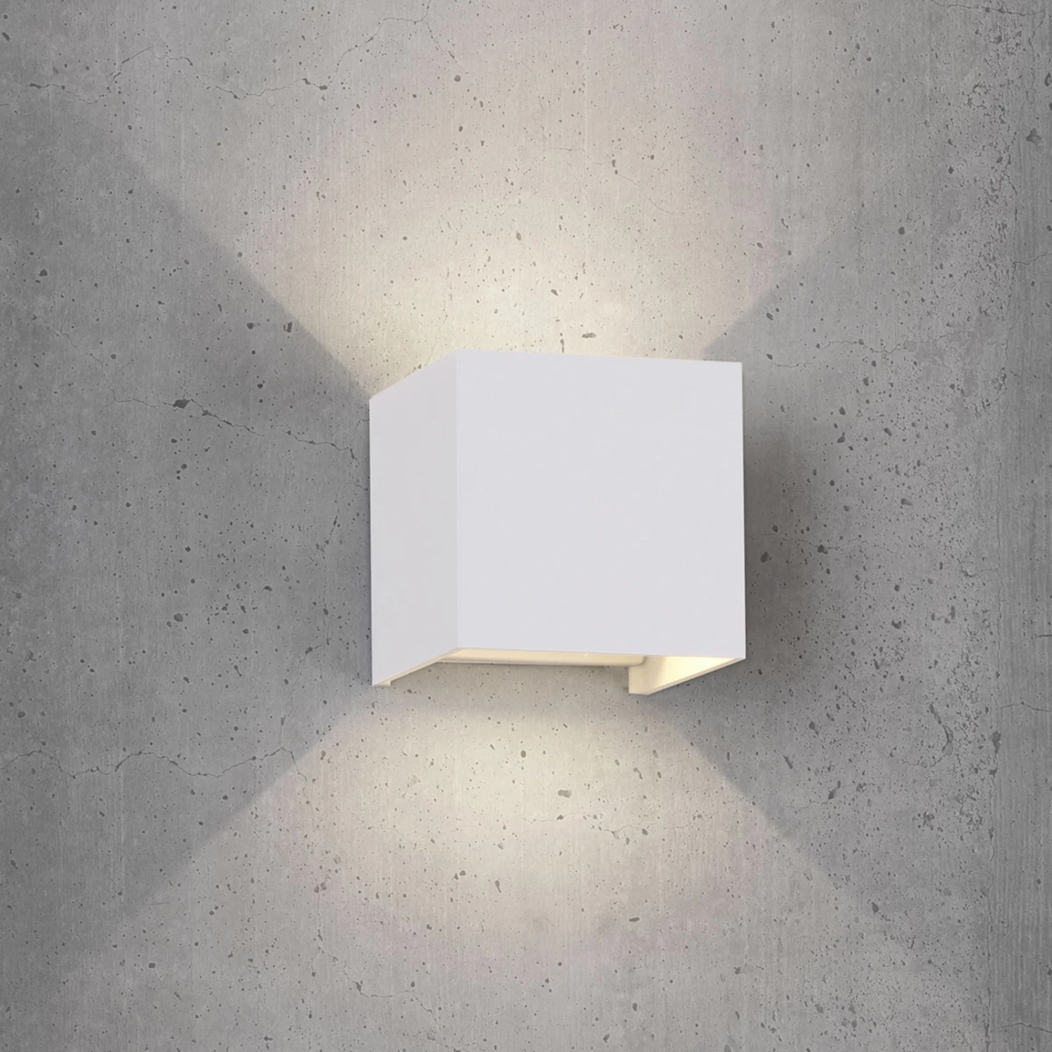 Tagsüber im ausgeschalteten Zustand stellt die LED-Außenwandleuchte aus Aluminium in schlichter Würfelform ein recht unscheinbares Element an der Wand dar. Das ändert sich jedoch, sobald das Licht eingeschaltet wird, denn dann wird durch die beidseitige Lichtabstrahlung jede Fassade dekorativ illuminiert.
