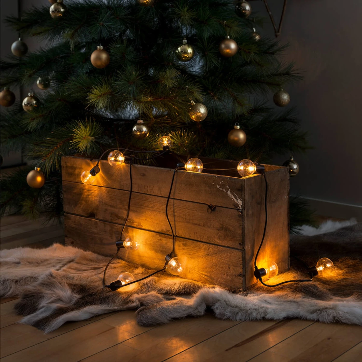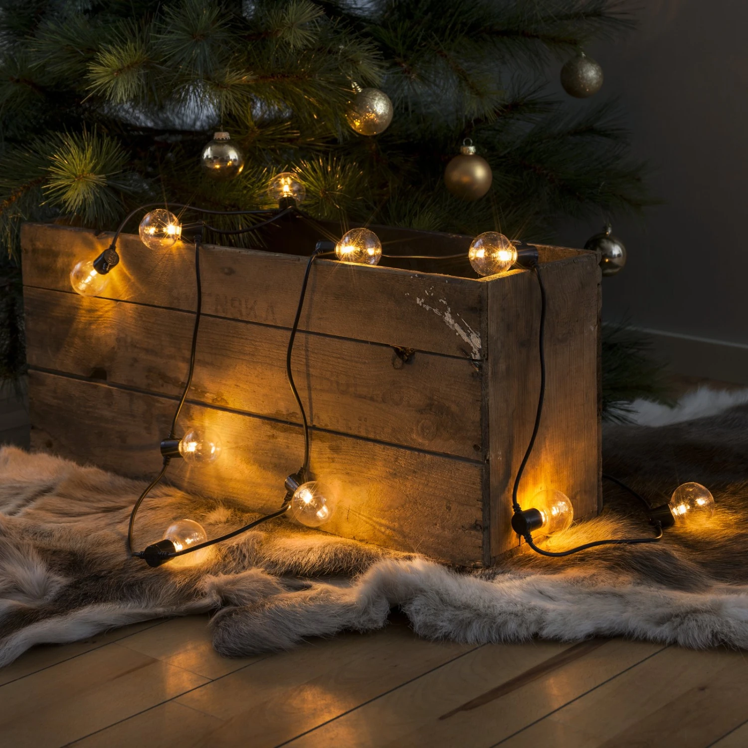 Mit dieser LED-Lichterkette mit den attraktiven Leuchtmitteln in Glühfadenoptik lassen sich überall im Außenbereich stimmungsvolle Dekoideen umsetzen. Besonders auffällig wirkt der gemütliche Charakter der Lichtabstrahlung der bernsteinfarben leuchtenden LEDs. Ein Netzanschluss in der Nähe ist nicht erforderlich, da die LED-Lichterkette mit Batterien bestückt wird: 4 x AA (nicht inklusive – über Zubehör erhältlich). Mit integriertem 6-Stunden-Timer.