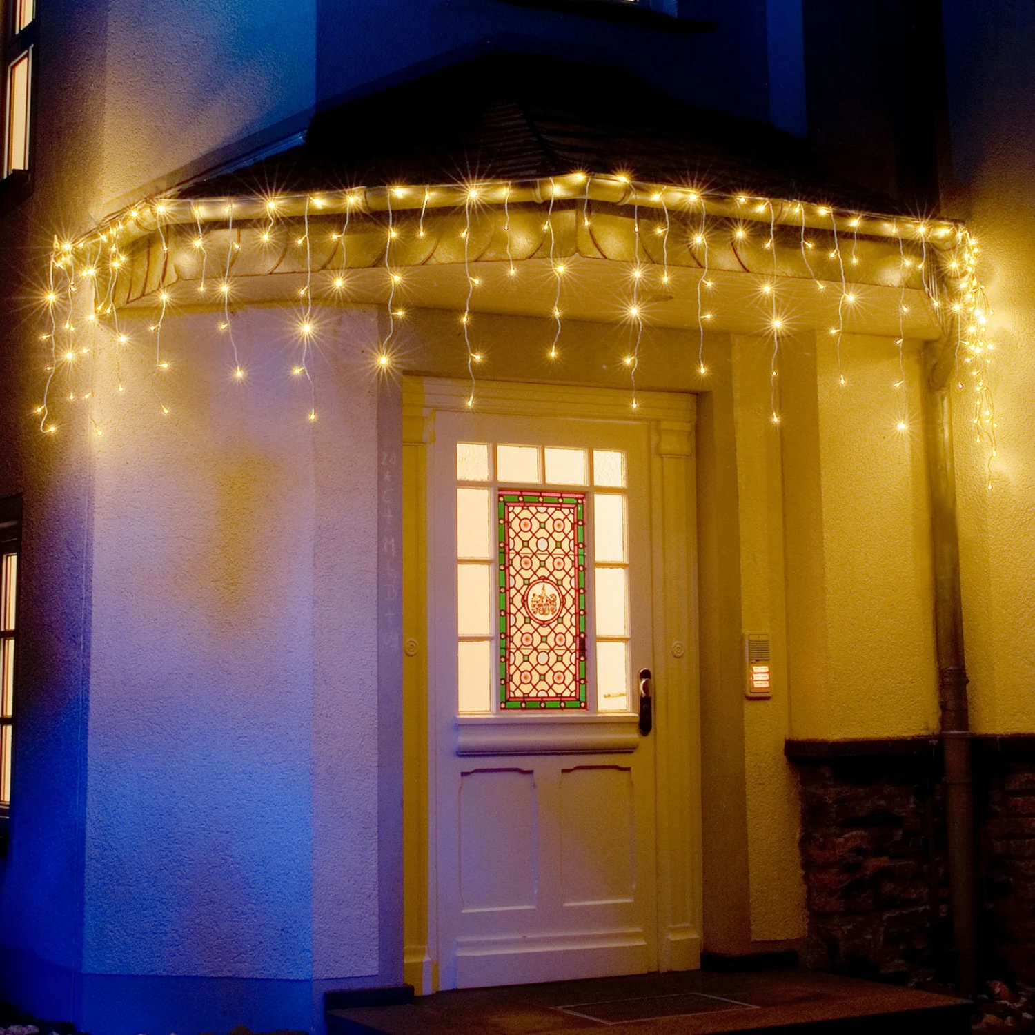 Fenster, Fassaden und Balkonbrüstungen lassen sich mit diesem LED-Lichtervorhang Eisregen komfortabel schmücken. Die zahlreichen Leuchtdioden strahlen sehr stimmungsvolles, warmweißes Licht ab, so dass der Eisregen ein behagliches Ambiente auf dem Grundstück erzeugt. Sein weithin sichtbarer Lichterglanz erhellt die dunkle Winternacht und lässt mit seinem Lichtschein das passende vorweihnachtliche Flair entstehen.