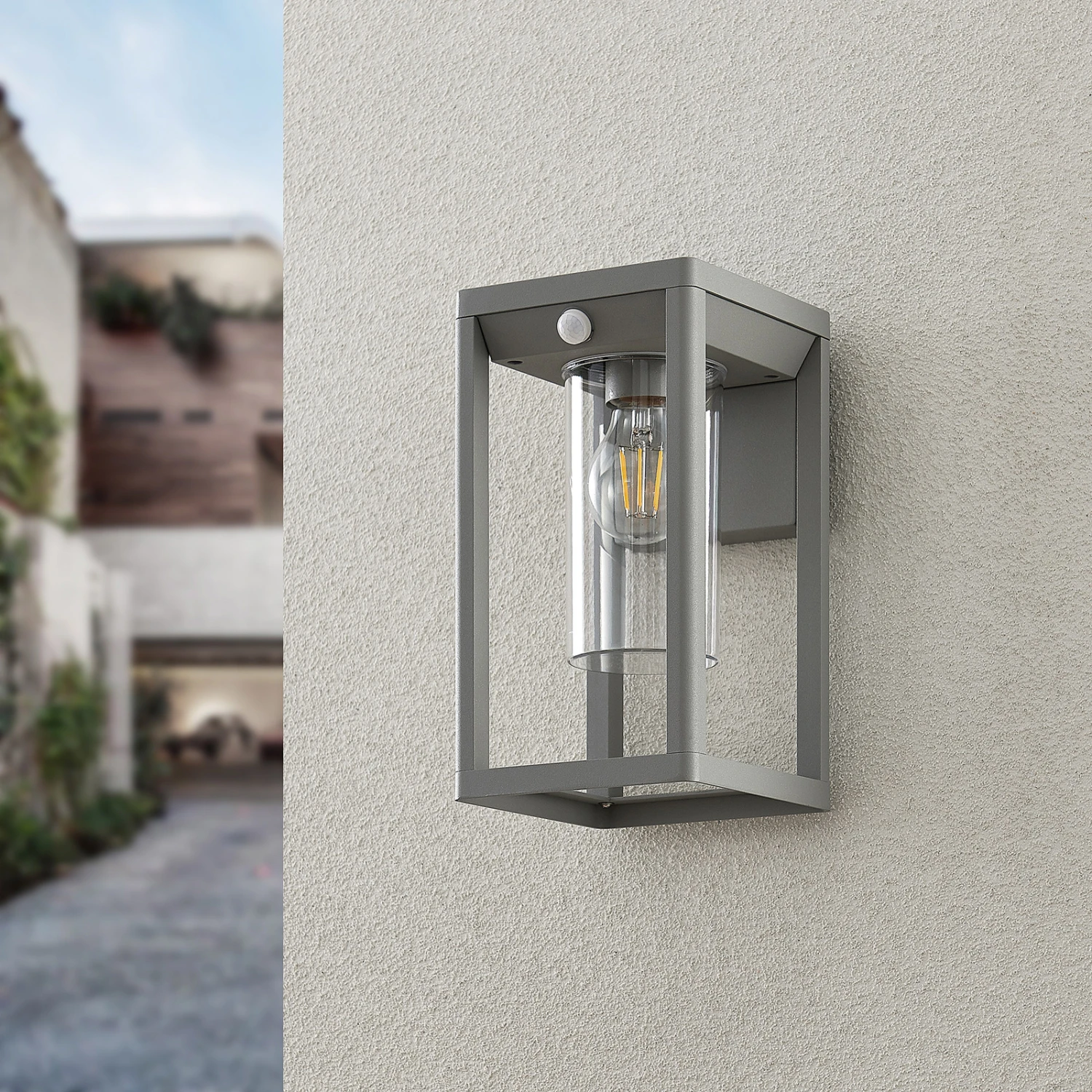 Graue Außenwandleuchte Estami mit integriertem Bewegungsmelder