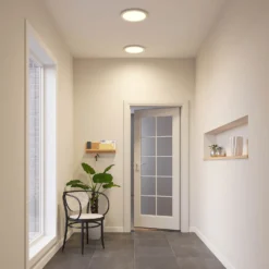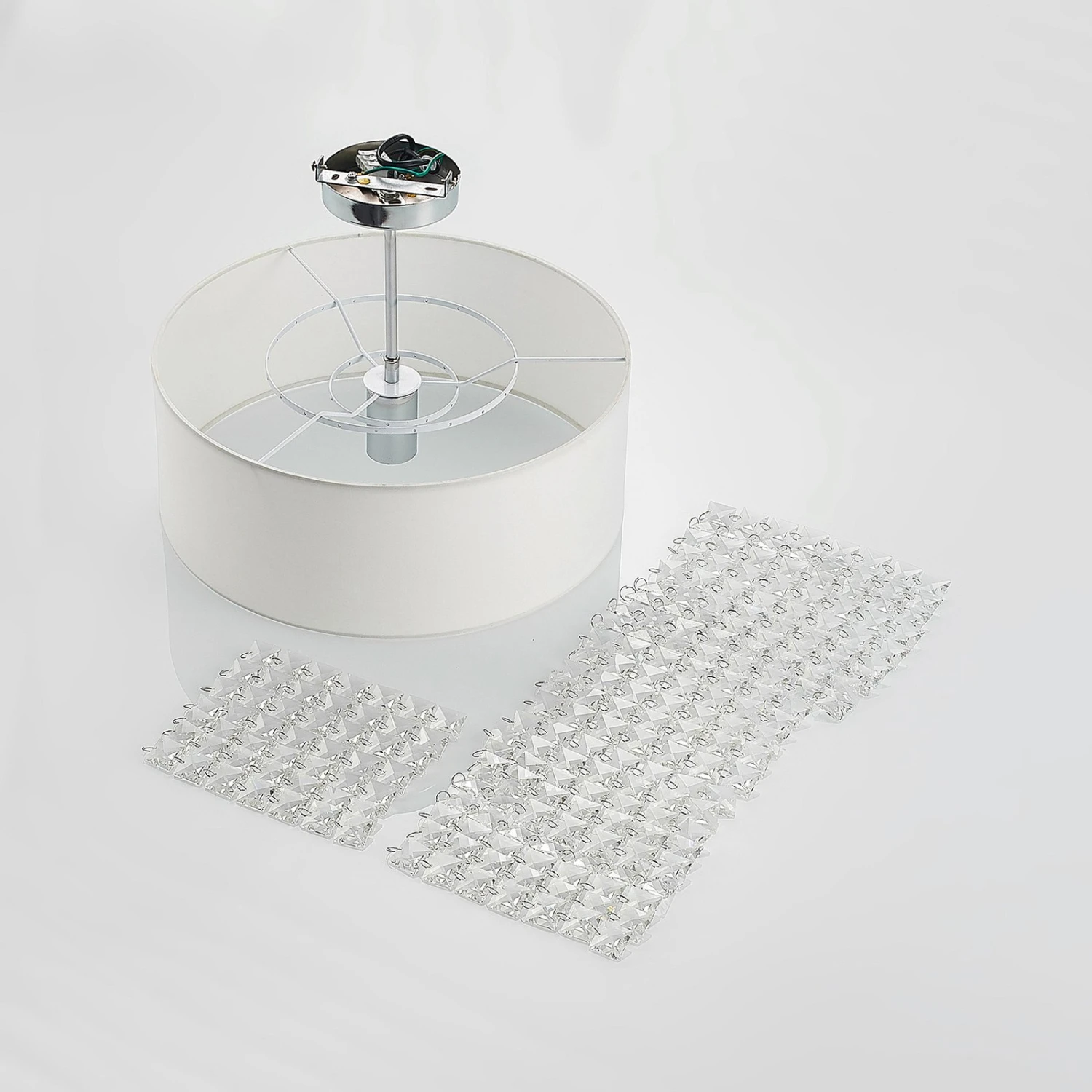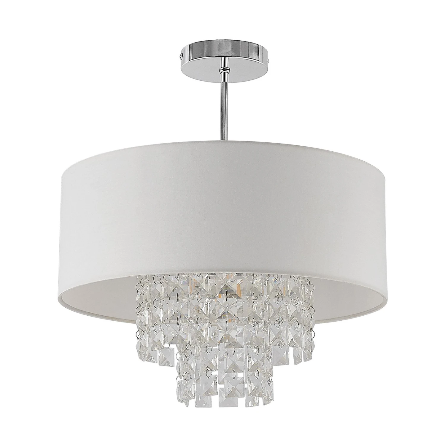 Die Deckenleuchte Estera besteht aus einem mit etwas Abstand von der Decke angebrachtem Lampenschirm, der aus weißem, stoffbezogenem Kunststoff gefertigt ist. Das chromfarbene Gestell und der ebenfalls chromglänzende Baldachin bilden mit dem weißen Schirm und den transparenten Glassteinen einen zauberhaften Kontrast. Die Steine hängen in der Mitte des Schirms an unterschiedlich langen Strängen und sorgen für die Eleganz und die wunderschöne Lichtwirkung, die beim Einschalten entsteht. Estera ist als Deckenleuchte zum Beispiel im Schlaf- oder Wohnzimmer perfekt geeignet, kann aber auch den Eingangsbereich sowie Flure wunderbar in Szene setzen.