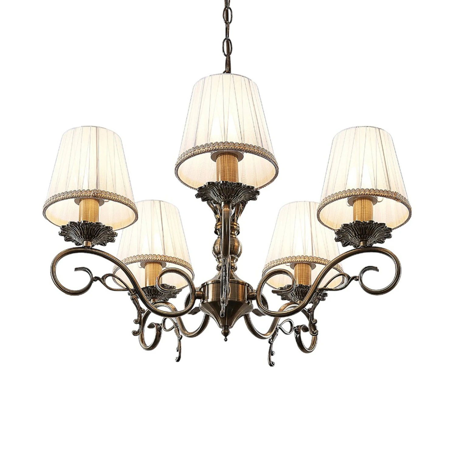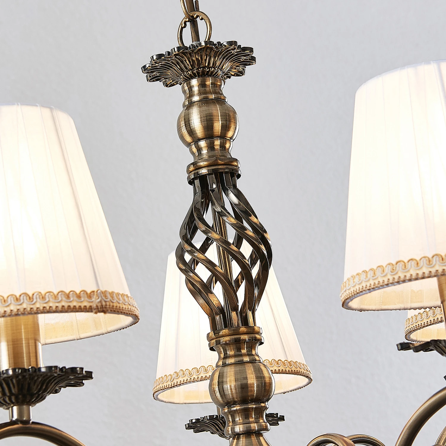 Der Kronleuchter Finnick hat ein Gestell in Altmessingoptik, das dem Kronleuchter durch die verschnörkelte und kunstvolle Linienführung einen eleganten und romantischen Charakter verleiht. Von dem Gestell aus gehen fünf Arme zu den Seiten, die durch ihre geschwungene Form an Pflanzenranken erinnern. An jedem der Arme ist ein weißer Lampenschirm aus Textil angebracht, der für eine weiche und angenehme Lichtverteilung sorgt. Finnick macht besonders über einem Esstisch eine gute Figur und erschafft im Raum ein gemütliches und gleichzeitig stilvolles Ambiente.