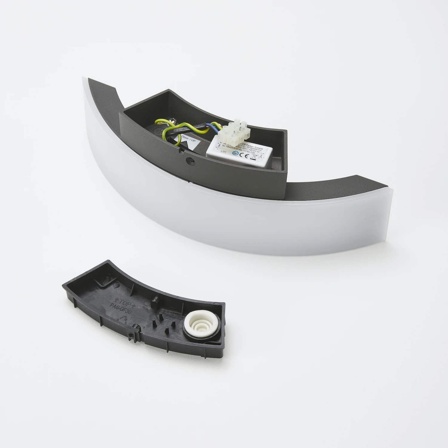 Ausschließlich nach unten weist der Lichtschein dieser LED-Außenwandleuchte, deren Aluminiumgestell grafitgrau lackiert wurde. An der Unterseite befindet sich ein weißer Diffusor, der die Leuchtmittel schützt und das Licht weicher verteilt. Als Markenprodukt von Epistar sind die SMD-LEDs nicht nur langlebig, sie verbrauchen zugleich auch kaum Energie. So kann im Außenbereich Beleuchtung erzeugt werden, die das Portemonnaie schützt, weil die Stromrechnung für die Außenbeleuchtung auf einem geringen Niveau bleibt.