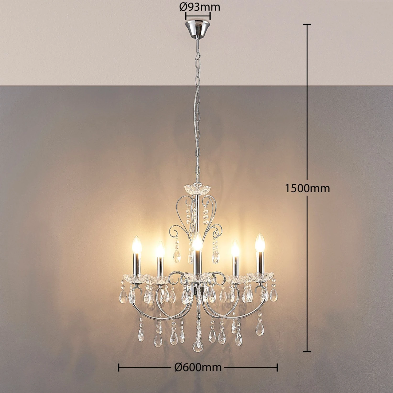 Solveig ist ein bezaubernder Kronleuchter, der mit 5 E14-Lampen betrieben wird und über ein reich verziertes Gestell verfügt, das auf spielerische Weise Ranken und gebogene Formen integriert. Zusätzlich dazu wird das Chromgestell von funkelnden K9-Kristallen geziert, die einen Ausdruck von Glamour und Luxus in den Raum bringen, weil sie so schön glitzern, sobald das Licht angeht.