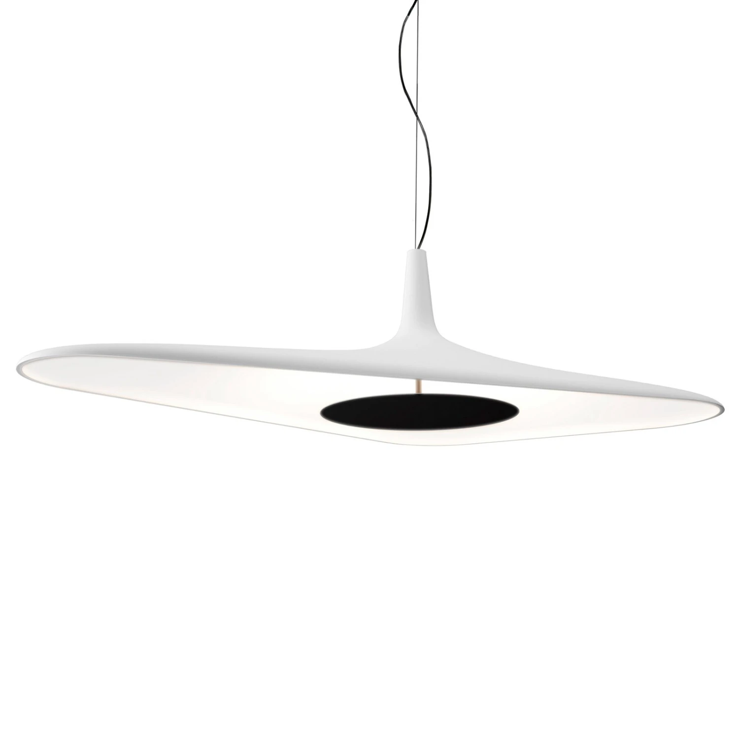 Soleil Noir, der Name dieser futuristisch anmutenden Leuchte, ist genauso wie ihre Erschafferin französisch und bedeutet „schwarze Sonne“. Schwarz ist im Fall dieser „Sonne“ nur das kleine Detail in der Mitte, das jedoch entscheidend für die Lichtwirkung ist. Die kleine runde Scheibe wirkt nämlich wie ein Diffusor und verteilt das Licht so, dass die Hängeleuchte komplett mit indirektem Licht arbeitet, was ihre Wirkung und die Atmosphäre sehr angenehm und gemütlich gestaltet.