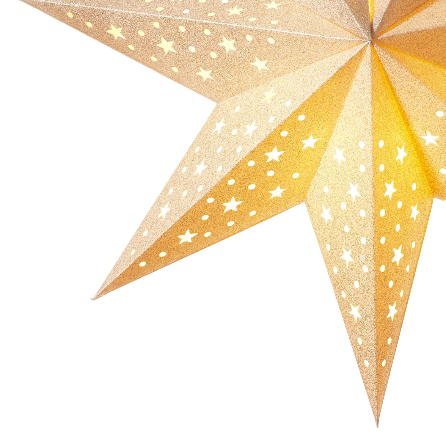 Gold ist eine der beliebtesten Dekorationsfarben rund um das Weihnachtsfest. Es wirkt festlich und geheimnisvoll zugleich. So wie der siebenzackige Papierstern Solvalla mit dem Loch- und Sterndurchbruchmuster, der ausgeschaltet schon sehr schön aussieht. Wird das Licht eingeschaltet, entfaltet sich die komplette Faszination dieses attraktiven Sterns.