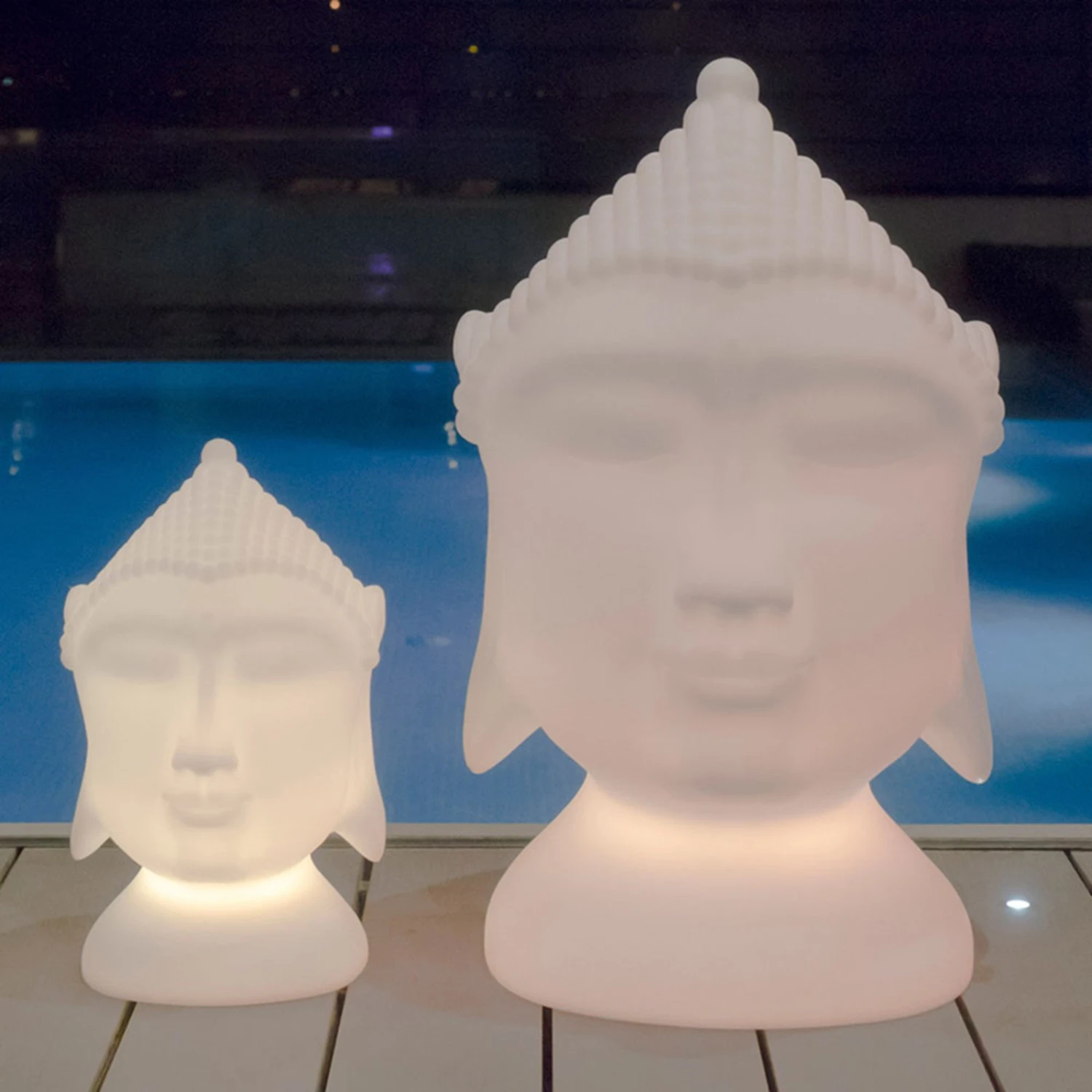 Eine Bereicherung in jedem Zen-Garten ist die Terrassenleuchte Goa, die in der Form eines Buddha-Kopfes gestaltet wurde. Die gesamte Leuchte besteht aus Polyethylen, einem Kunststoff, der uv-beständig und widerstandsfähig in besonderen Temperaturen ist.