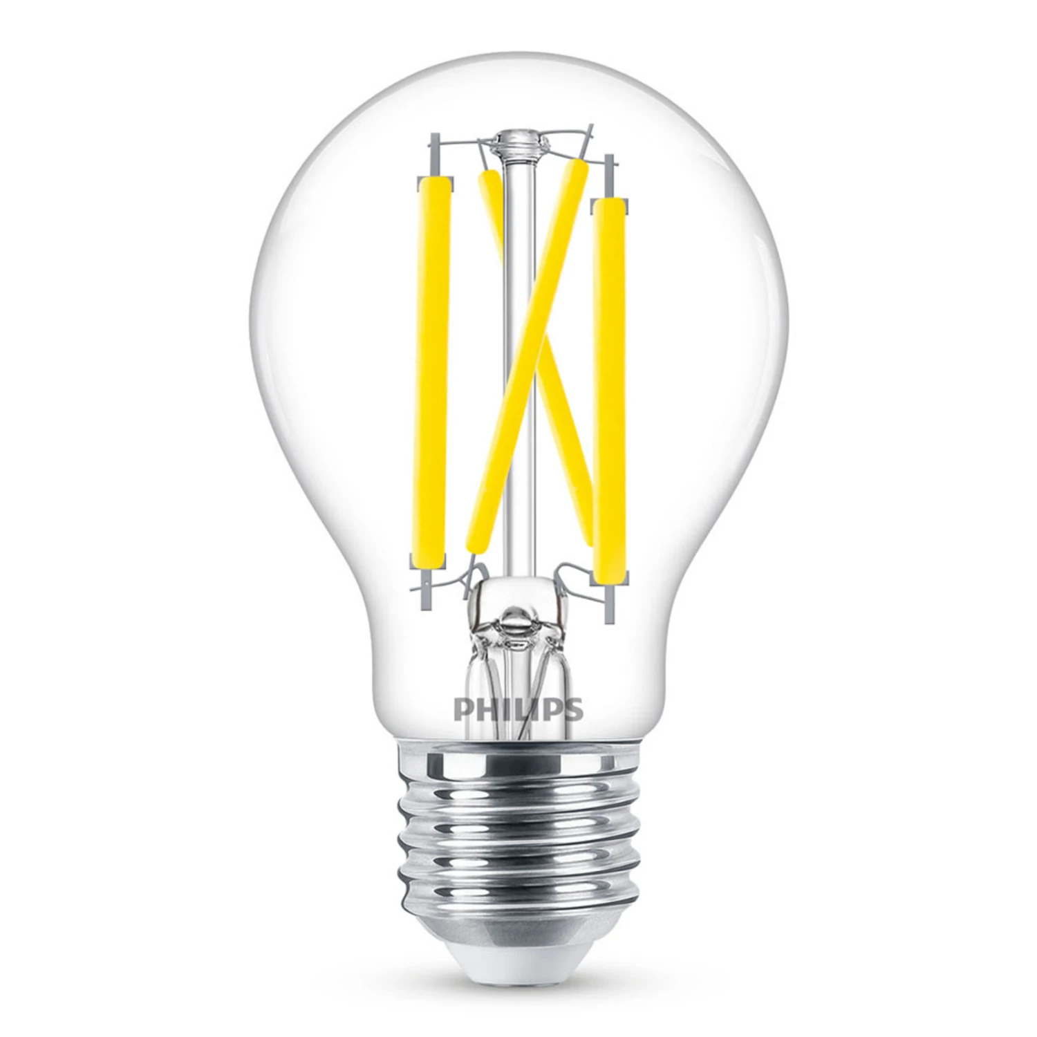 E27 LED-Lampe Filament 10,5W in Birnenform, klar, WarmGlow – klares Leuchtmittel mit Filamentoptik – WarmGlow dimmbar – mit vielen Dimmern dimmbar, das Licht wird mit dem Dimmvorgang wärmer (2.700 – 2.200 K) – erfüllt die Philips Eye comfort Anforderungen und spendet eine augenschonende, angenehme Beleuchtung