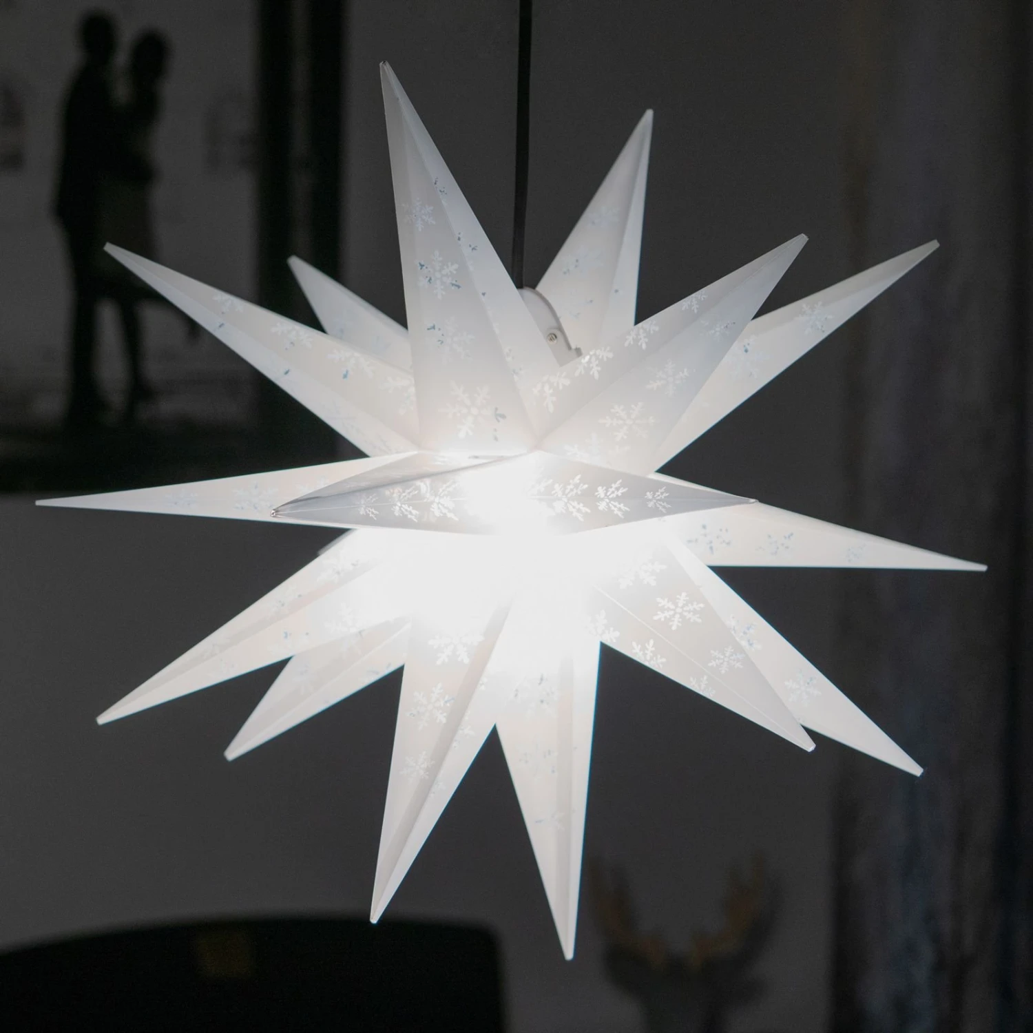 Dieser weiße Deko-Stern leuchtet nicht nur hell in die Nacht hinein. Er weist auch ein faszinierendes Muster aus aufgedruckten Schneeflocken auf, das gemeinsam mit der dekorativen Form des 18-zackigen Sterns aus dem Stern eine sehr auffällige Außendekoration macht.