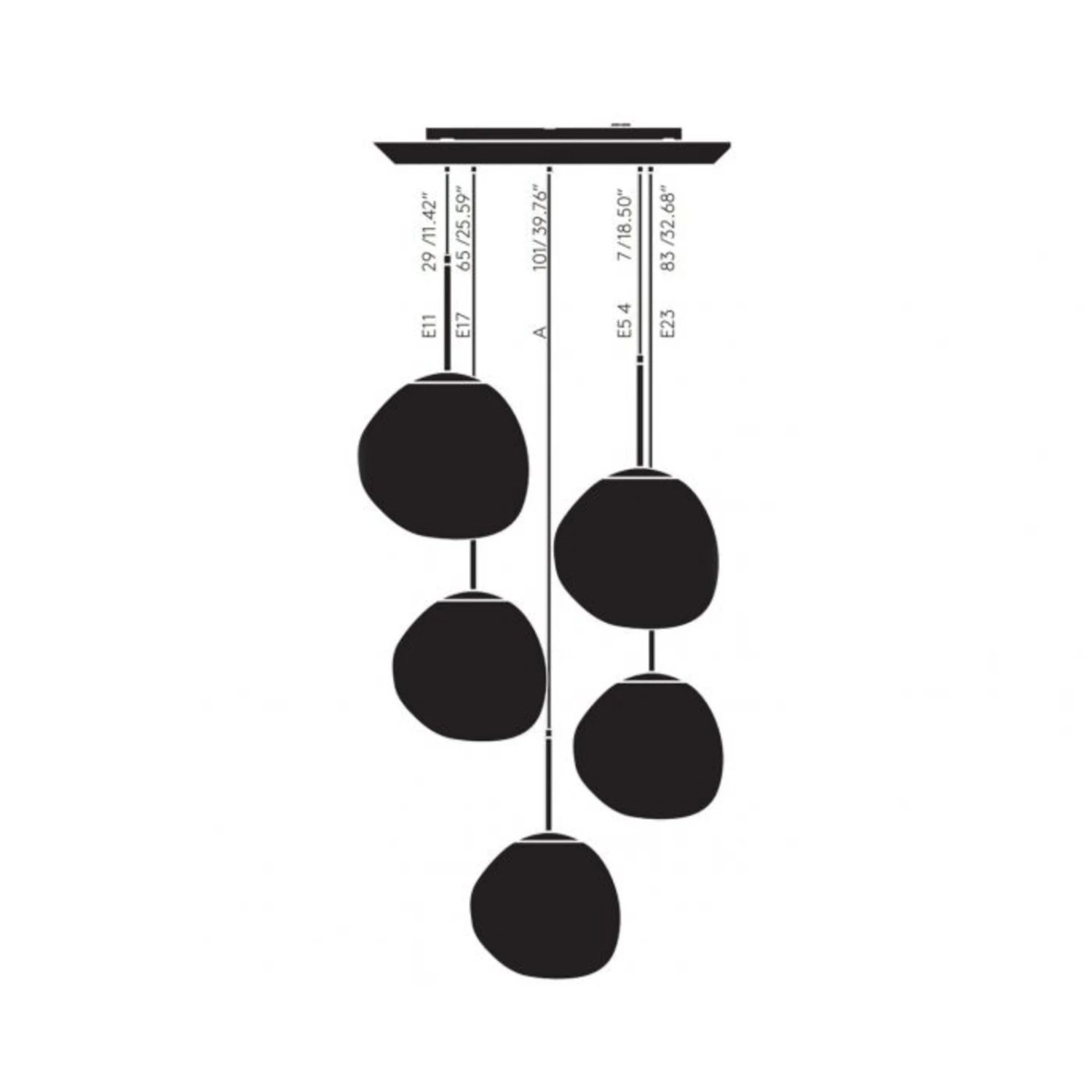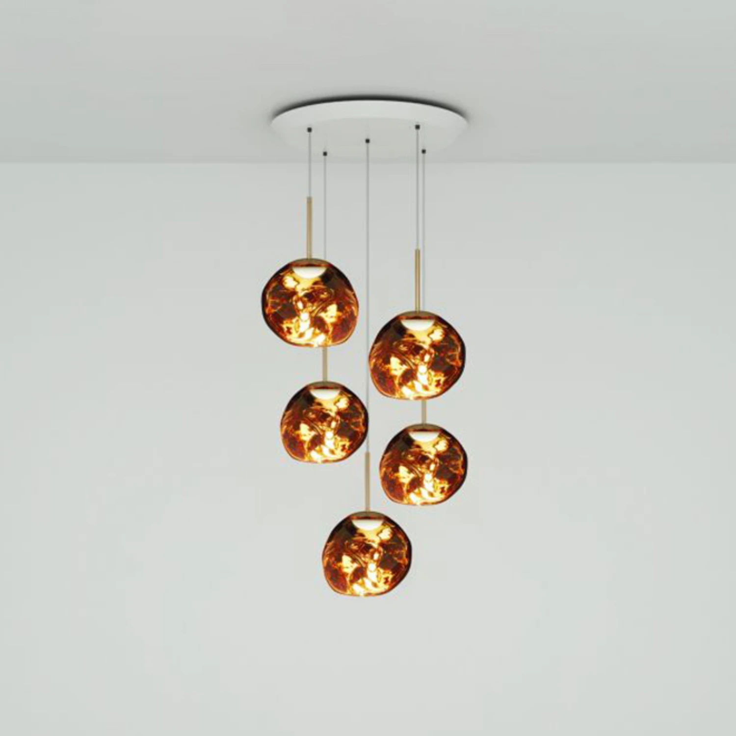 Ein spezielles, hoch technisiertes Produktionsverfahren sorgt bei der fünfflammigen Hängelampe Melt Mini Round für eine optische Täuschung. Die Schirme von Melt Mini Round sehen aus, als wären sie aus geschmolzenem Glas gearbeitet. Dabei handelt es sich bei dem Schirmmaterial um Polycarbonat, einen Kunststoff, der so bearbeitet wurde, dass ein beeindruckender Schmelzeffekt entsteht, wenn das LED-Licht eingeschaltet ist.